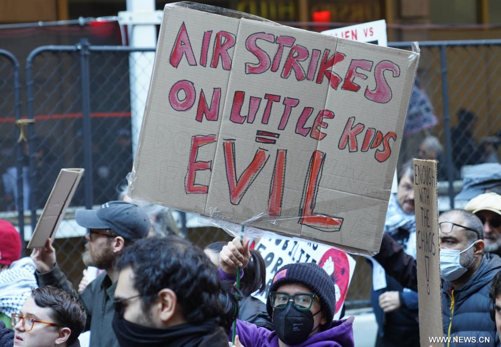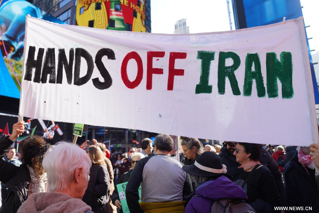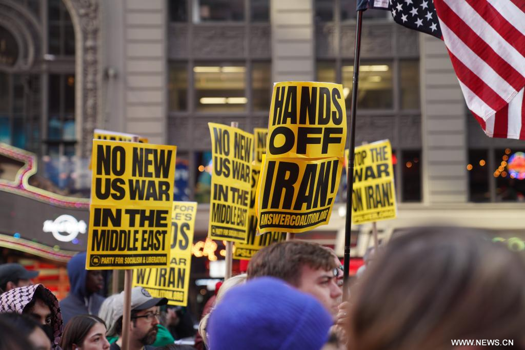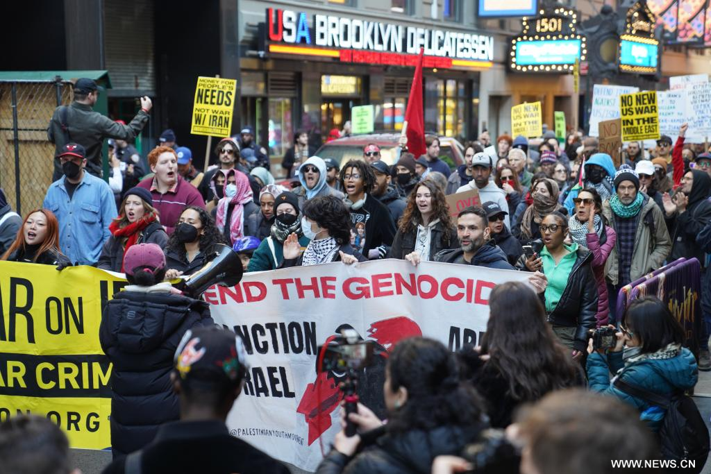 نيويورك 28 فبراير 2026 (شينخوا) تجمع المئات من سكان نيويورك في ساحة تايمز سكوير ثم ساروا في شوارع مدينة نيويورك يوم السبت احتجاجا على الغارات الجوية المنسقة بين الولايات المتحدة وإسرائيل ضد إيران.