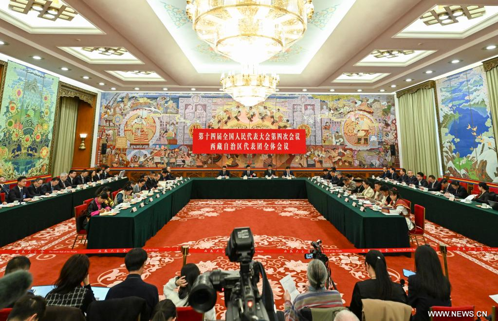 بكين 7 مارس 2026 (شينخوا) في الصورة الملتقطة يوم 6 مارس 2026، جانب من اجتماع جماعي لنواب وفد منطقة شيتسانغ ذاتية الحكم في الدورة الرابعة للمجلس الوطني الـ14 لنواب الشعب الصيني في بكين.