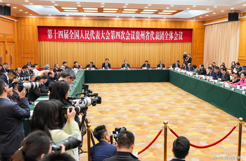 بكين 7 مارس 2026 (شينخوا) في الصورة الملتقطة يوم 6 مارس 2026، جانب من اجتماع جماعي لنواب وفد مقاطعة قويتشو في الدورة الرابعة للمجلس الوطني الـ14 لنواب الشعب الصيني في بكين.