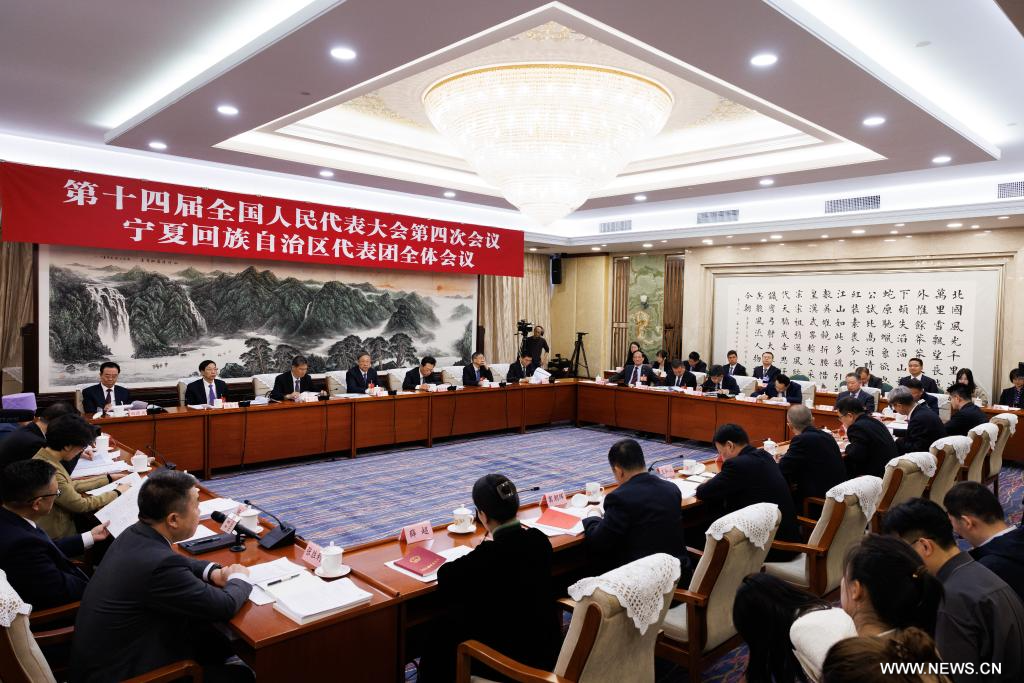 بكين 7 مارس 2026 (شينخوا) في الصورة الملتقطة يوم 6 مارس 2026، جانب من اجتماع جماعي لنواب وفد منطقة نينغشيا ذاتية الحكم لقومية هوي في الدورة الرابعة للمجلس الوطني الـ14 لنواب الشعب الصيني في بكين.