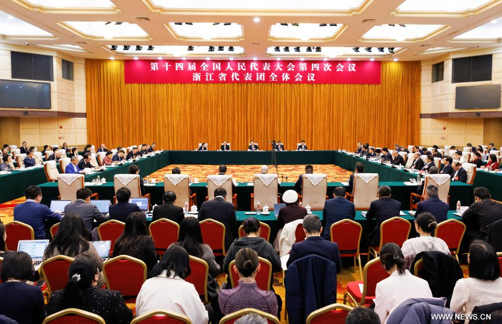 بكين 7 مارس 2026 (شينخوا) في الصورة الملتقطة يوم 6 مارس 2026، جانب من اجتماع جماعي لنواب وفد مقاطعة تشجيانغ في الدورة الرابعة للمجلس الوطني الـ14 لنواب الشعب الصيني في بكين.