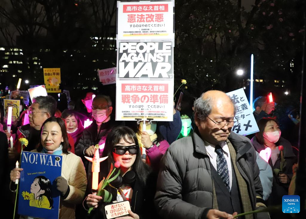 طوكيو 11 مارس 2026 (شينخوا) تجمع قرابة 10 آلاف شخص مساء الثلاثاء في وسط العاصمة اليابانية طوكيو، للاحتجاج على السياسات الخطيرة التي تنتهجها حكومة رئيسة الوزراء اليابانية ساناي تاكايتشي، بما في ذلك نشر الصواريخ والدفع نحو تخفيف القيود المفروضة على تصدير الأسلحة الفتاكة.