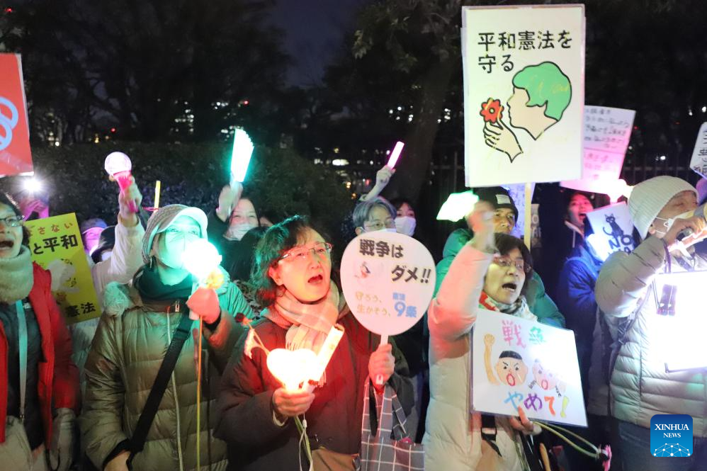 وعلى الرغم من برودة الجو، رفع المتظاهرون أمام مبنى البرلمان الوطني (الدايت) لافتات كتب عليها "لا للحرب!" و"توقفوا عن انتهاك الدستور!"، كما قرأوا بصوت جماعي المادة التاسعة من الدستور الياباني، مؤكدين تمسكهم بمبادئ بلادهم السلمية.