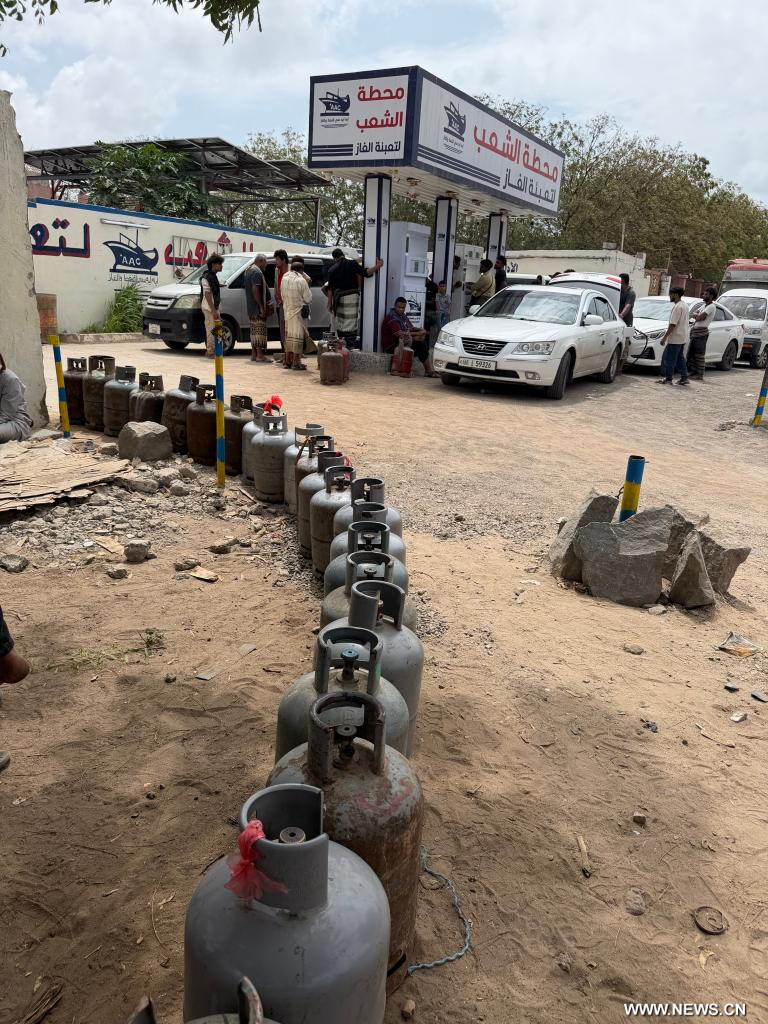 صنعاء 24 مارس 2026 (شينخوا) في الصورة الملتقطة بهاتف محمول، سكان يقفون بالقرب من صفوف من أسطوانات غاز الطهي تحت شجرة في انتظار إعادة تعبئتها في مدينة عدن الساحلية الجنوبية، اليمن، يوم 24 مارس 2026.