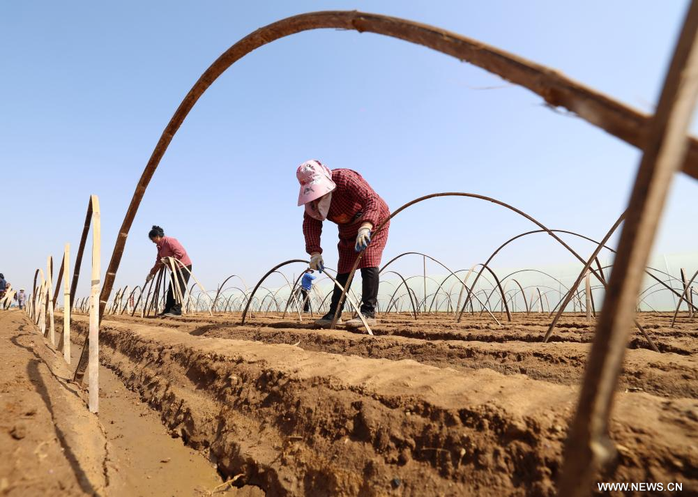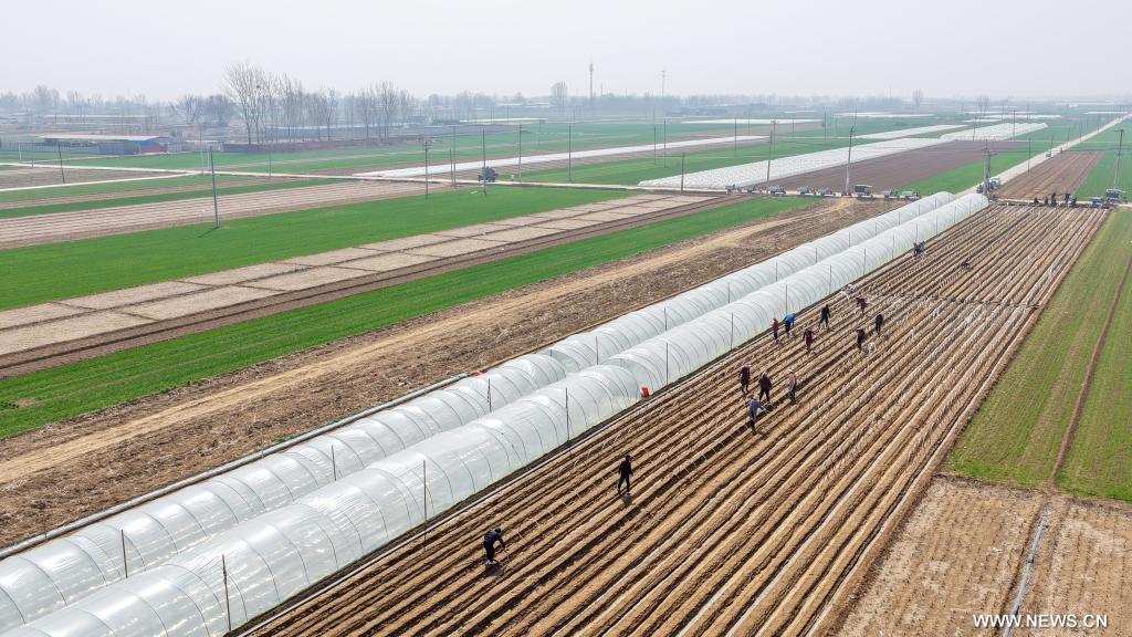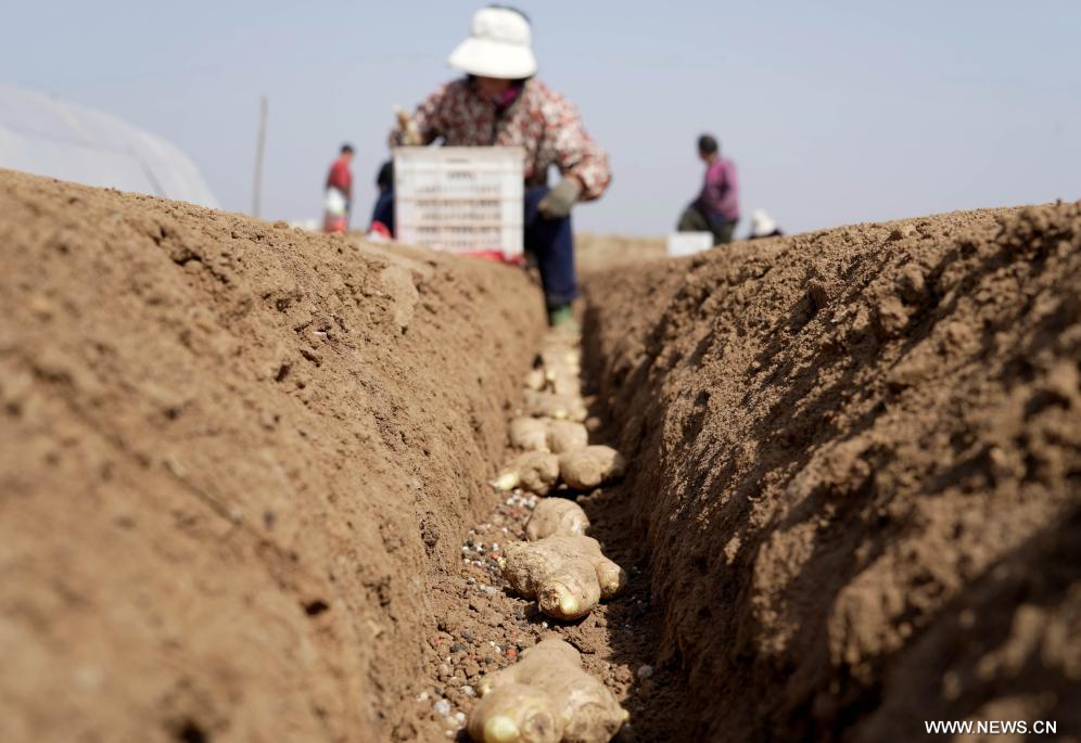 بكين 26 مارس 2026 (شينخوا) في الصورة الملتقطة يوم 25 مارس 2026، مزارعون يزرعون زنجبيل ببلدة نانتشياو في محافظة شينغتانغ بمدينة شيجياتشوانغ في مقاطعة خبي شمالي الصين. وقد انشغل المزارعون في جميع أنحاء الصين مؤخرا بأعمال الحرث الربيعي.
