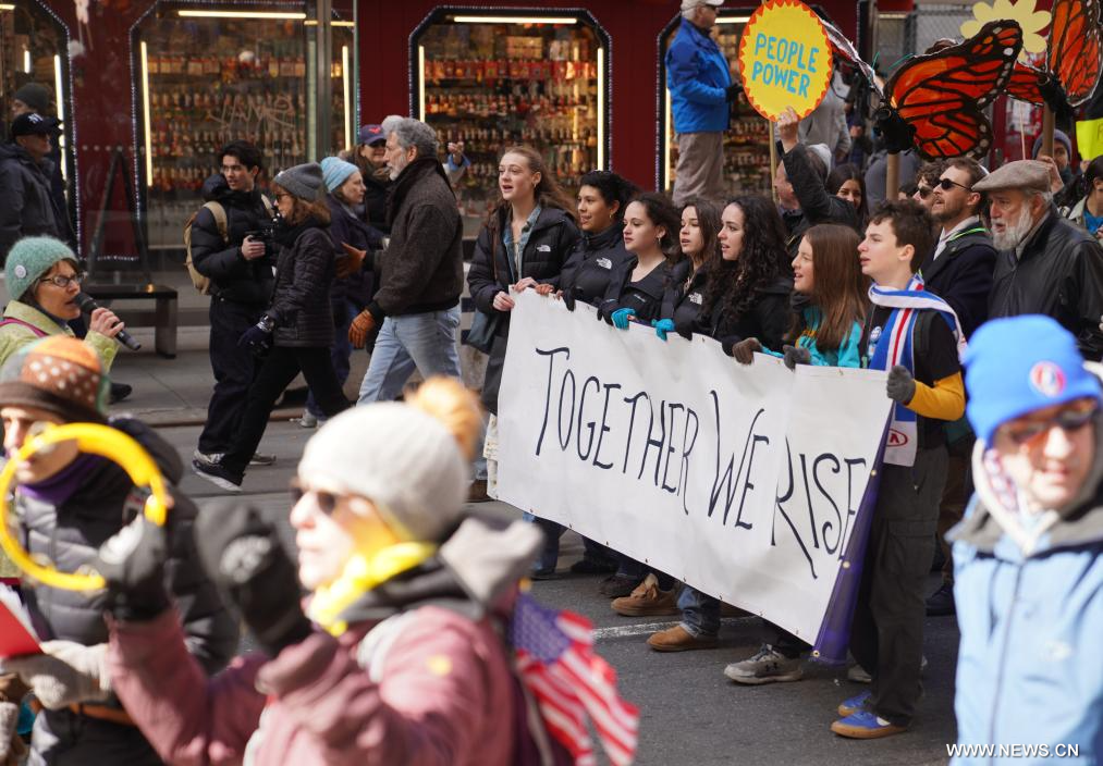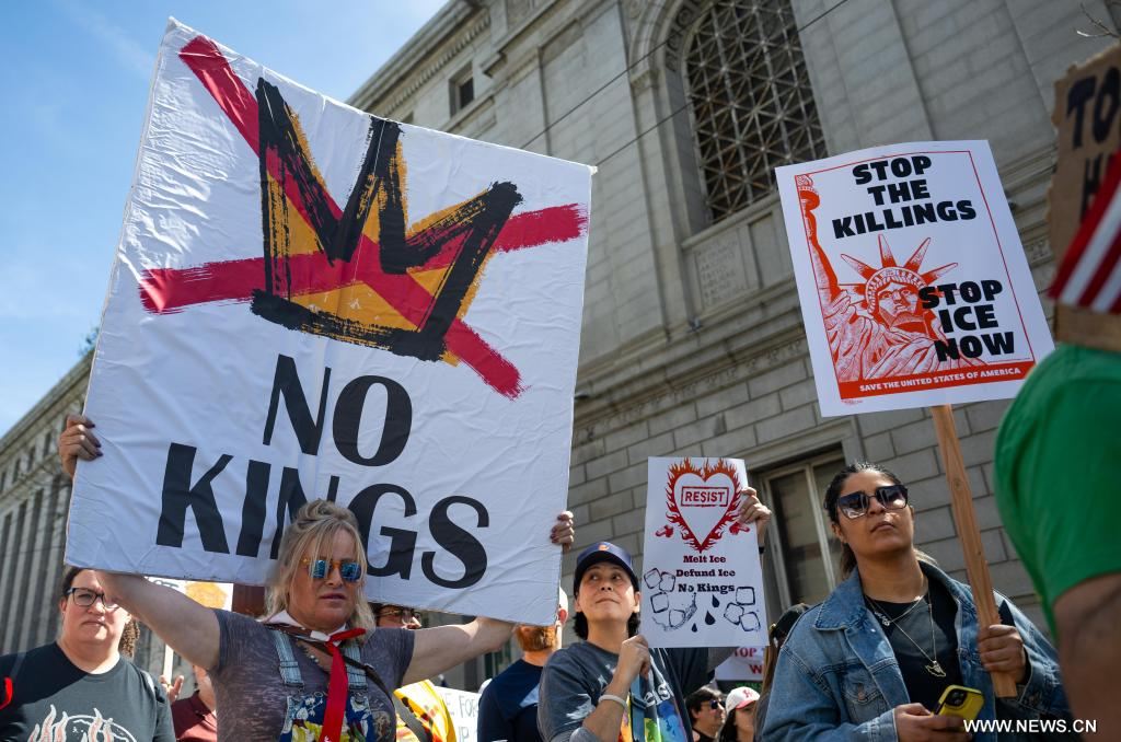 نيويورك 29 مارس 2026 (شينخوا) في الصورة الملتقطة يوم 28 مارس 2026، أشخاص يشاركون في احتجاجات "لا للملوك" في مدينة نيويورك في الولايات المتحدة. خرج ملايين الأمريكيين إلى الشوارع أمس (السبت) ضمن الموجة الثالثة من مسيرات "لا للملوك" في مختلف أنحاء البلاد، احتجاجا على سياسات الإدارة الأمريكية، بدءا من العمل العسكري في إيران وصولا إلى إنفاذ قوانين الهجرة المثيرة للجدل.