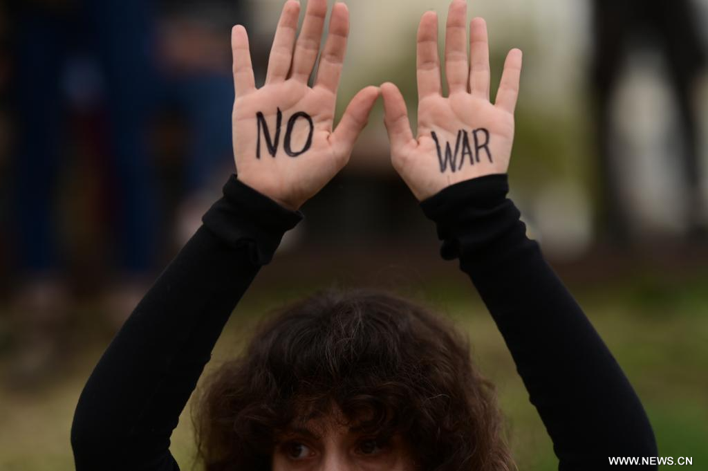 بكين 30 مارس 2026 (شينخوا) في الصورة الملتقطة يوم 14 مارس 2026، متظاهرة ترفع يديها وعليهما شعار "لا للحرب" خلال مسيرة للاحتجاج على الهجمات الأمريكية-الإسرائيلية على إيران والمطالبة بإنهاء جميع أعمال الحرب، في تل أبيب، إسرائيل.