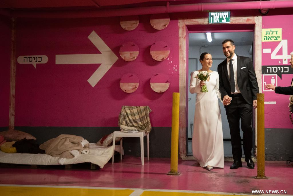 بكين 30 مارس 2026 (شينخوا) في الصورة الملتقطة يوم 3 مارس 2026، زوجان يقيمان حفل زفاف في ملجأ في تل أبيب، إسرائيل.