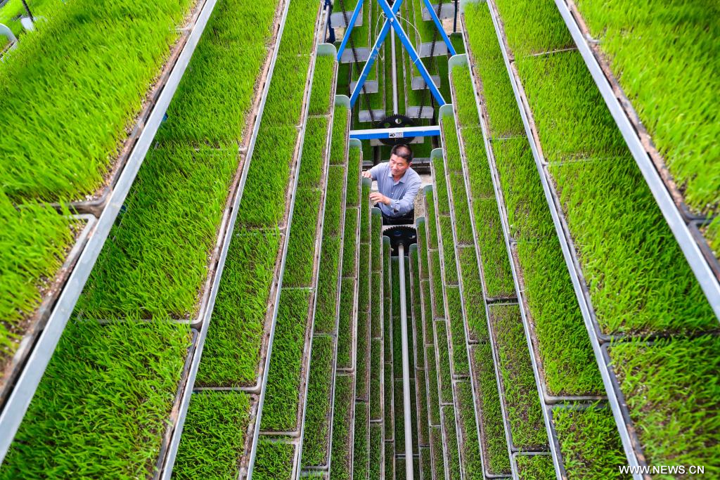 بكين 8 أبريل 2026 (شينخوا) في الصورة الملتقطة يوم 6 أبريل 2026، موظف يعتني بشتلات الأرز في مصنع الشتلات الذكي في محافظة قوانغشان بمقاطعة خنان في وسط الصين.