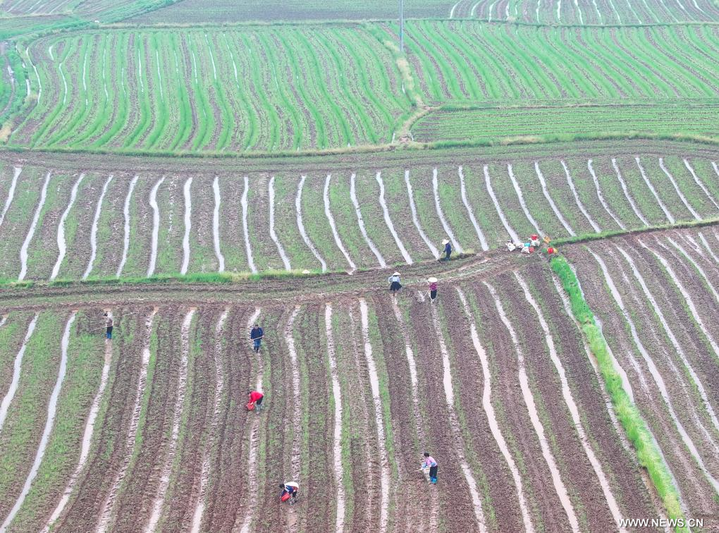 بكين 8 أبريل 2026 (شينخوا) في الصورة الملتقطة يوم 7 أبريل 2026، مزارعون يعملون في حقول ببلدة شيتان في محافظة هنغدونغ بمقاطعة هونان بوسط الصين.