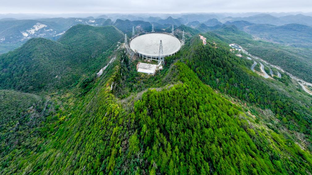 في الصورة الملتقطة يوم 18 فبراير 2025، التلسكوب الراديوي الكروي الصيني بقطر 500 متر "فاست" تحت الصيانة في مقاطعة قويتشو بجنوب غربي الصين.(شينخوا)