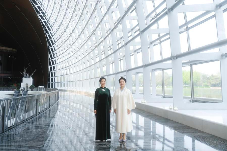 بكين 15 أبريل 2026 (شينخوا) قامت بنغ لي يوان، عقيلة شي جين بينغ الأمين العام للجنة المركزية للحزب الشيوعي الصيني والرئيس الصيني، ونغو فونغ لي، عقيلة تو لام، الأمين العام للجنة المركزية للحزب الشيوعي الفيتنامي والرئيس الفيتنامي، بزيارة المركز الوطني الصيني للفنون المسرحية، في بكين اليوم (الأربعاء).