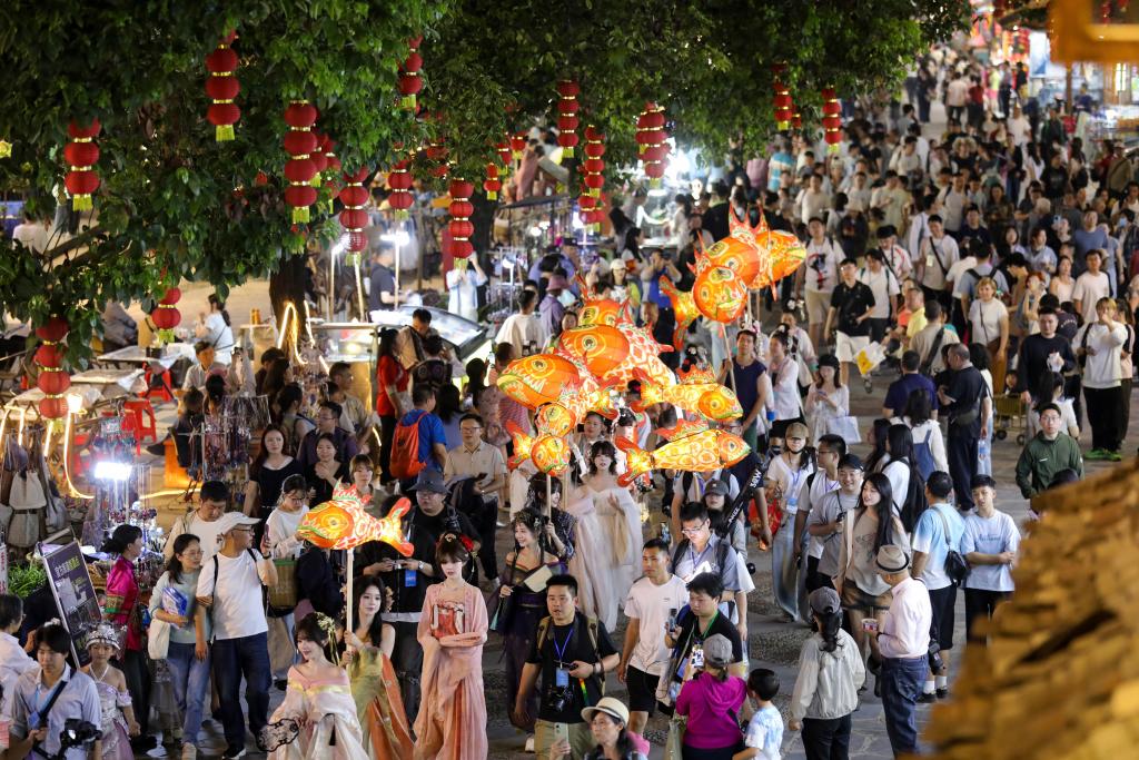 ليبينغ 22 أبريل 2026 (شينخوا) في الصورة الملتقطة يوم 18 أبريل 2026، سياح يستمتعون بموكب فوانيس بقرية تشاوشينغ لقومية دونغ في محافظة ليبينغ بمقاطعة قويتشو بجنوب غربي الصين.