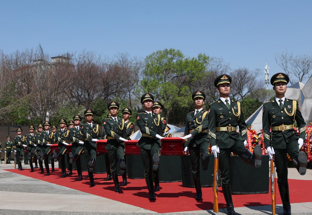 شنيانغ 24 أبريل 2026 (شينخوا) تم دفن رفات 12 جنديا من متطوعي الشعب الصيني استشهدوا خلال حرب مقاومة العدوان الأمريكي ومساعدة كوريا (1950-1953) في مقبرة شهداء متطوعي الشعب الصيني في مدينة شنيانغ بمقاطعة لياونينغ بشمال شرقي الصين يوم الخميس الماضي.
